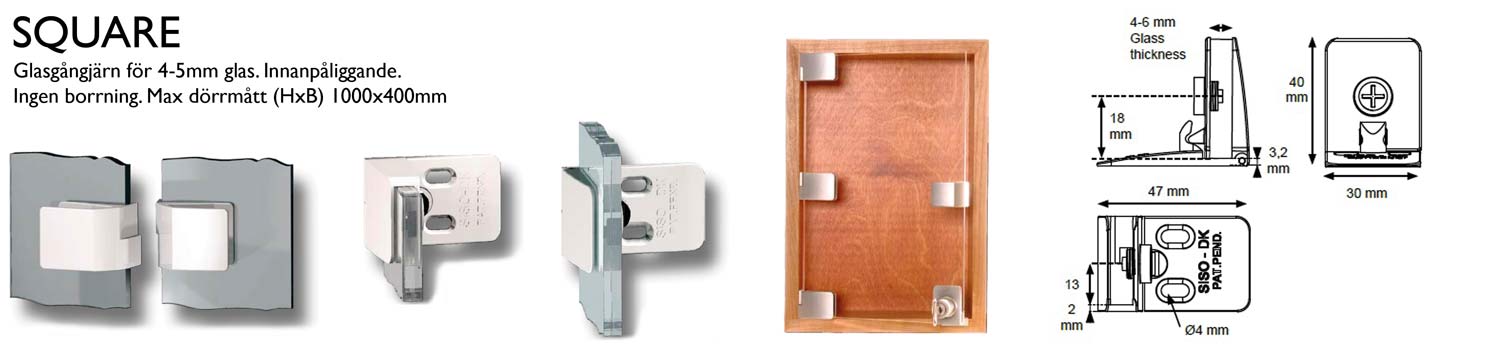 För 4-6mm glas. Utanpåliggande.Gångjärn