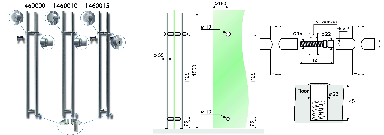 Mycket prisvärd i rostfritt borstad 304. Komplett med lås och dörrhandtag. Ø35mm x 1500mm, CC: 1125mm. För 8-12mm glas.H-handtag 2 låscylindrar