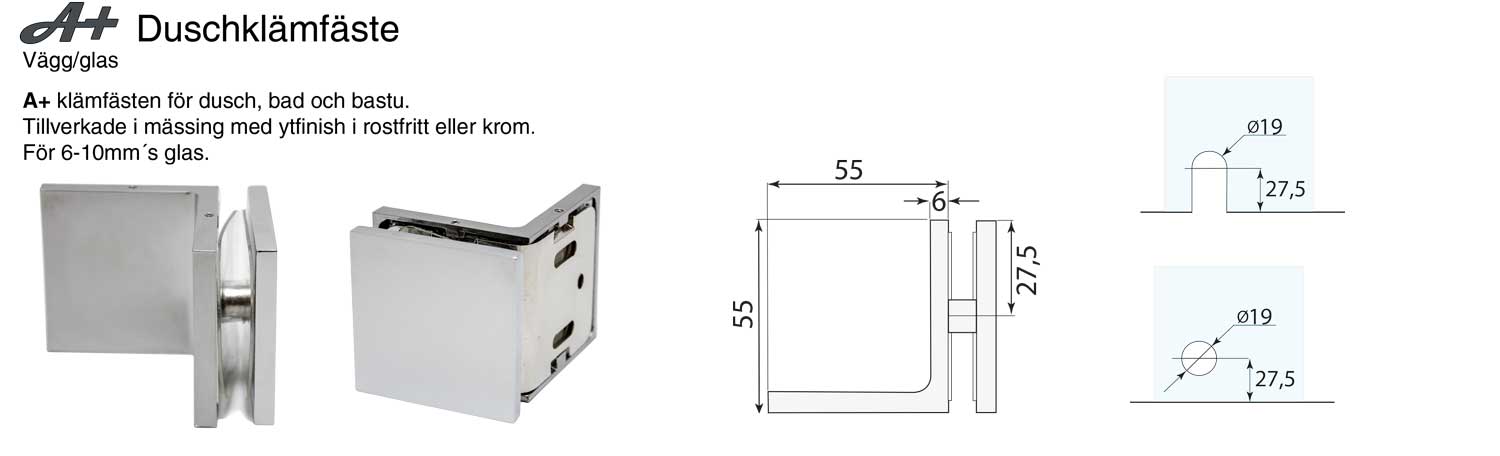 Duschklämfäste i mässing med ytfinish i rostfri finish. 6-10mm´s glas. Glas/glas