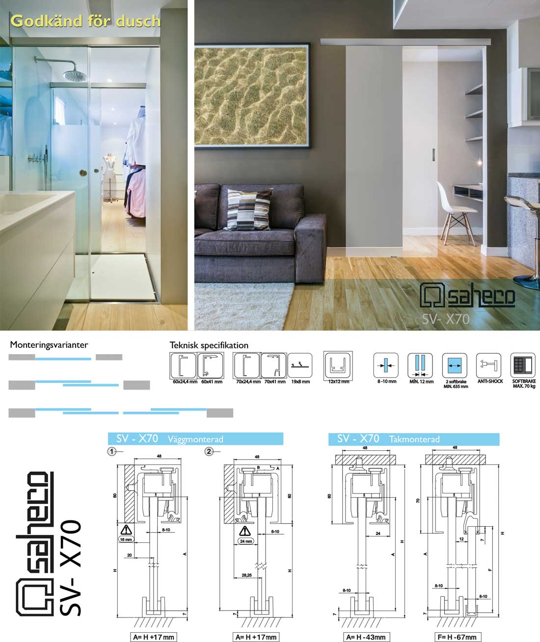 Komplett Saheco beslagssats för nischmontering i krom med 1 dörr och 2 softclose, 8-10mm glas. SV-X70 är godkänd för dusch. Längd 2130mm. Maxvikt 70kg.SV-X70 dusch Krom 2130