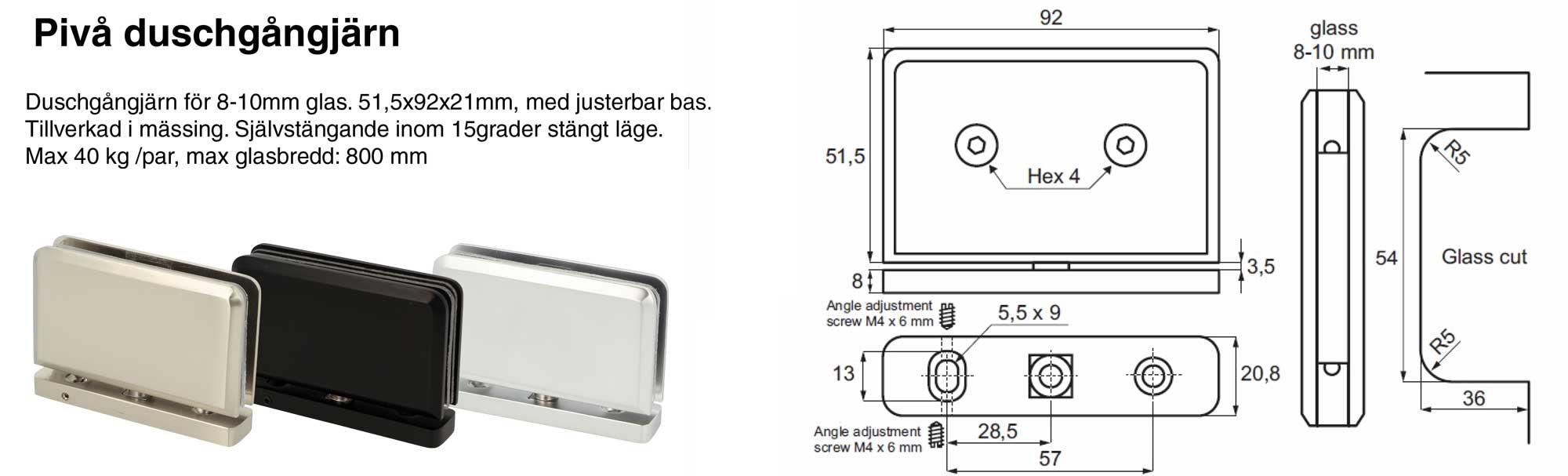 Duschgångjärn för 8-10mm glas. 51,5x92x21mm, med justerbar bas. Tillverkad i mässing. Självstängande inom 15° stängt läge. Max 40 kg /par, max glasbredd: 800 mmKrom