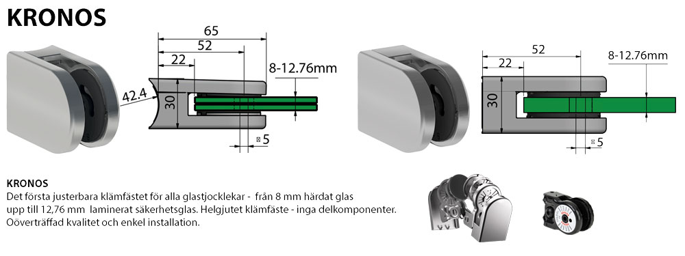För rundrör 42,4mm Längd 65, bredd 30, höjd 45mm. Justerbar för 8-12.76mm glasKRONOS Borstad 316 42,4mm