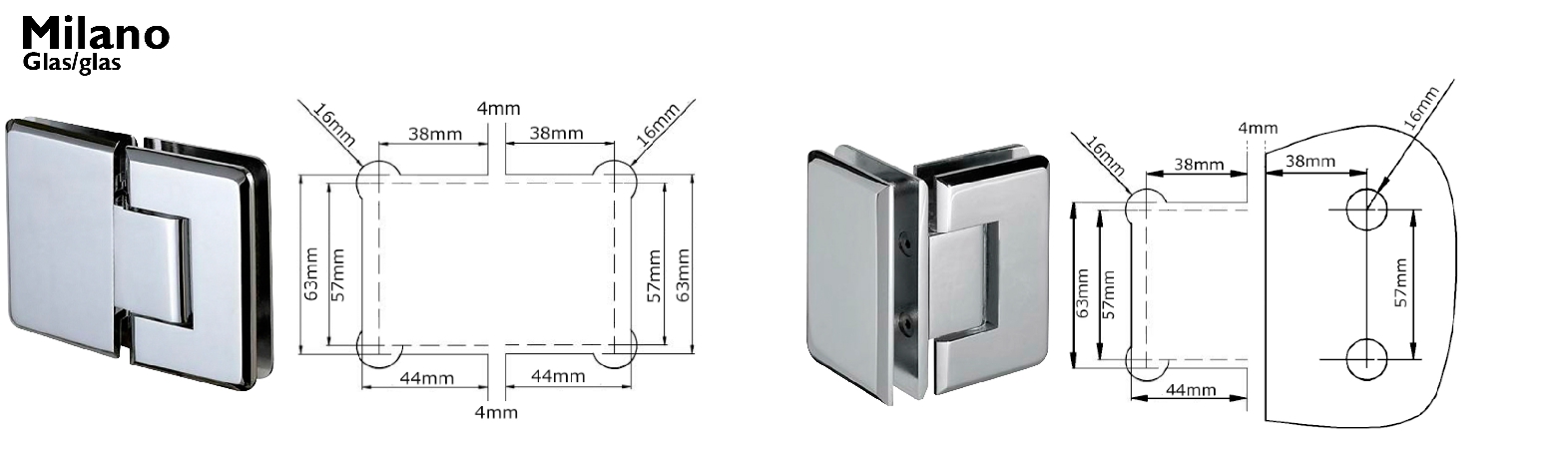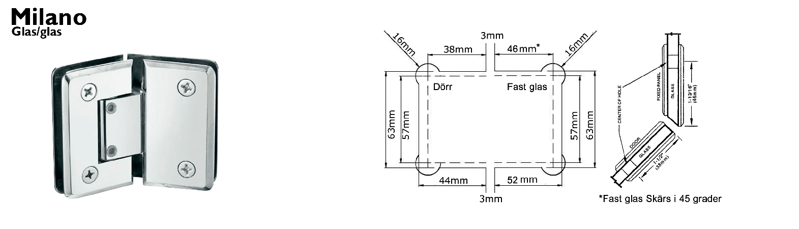 Duschgångjärn glas/glas justerbara med rundad och fasad kant. Mässing gångjärn till 6-12mm´s glas. Självstängande. Justerbar vinkel. Max 40kg/par.
