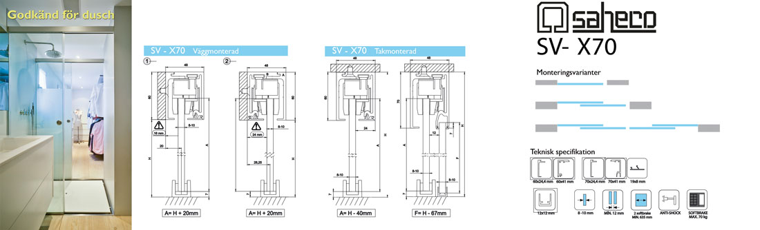 Komplett Saheco beslagssats för nischmontering i krom med 1 dörr och 2 softclose, 8-10mm glas. SV-X70 är godkänd för dusch. Längd 2130mm. Maxvikt 70kg.SV-X70 dusch Krom 2130